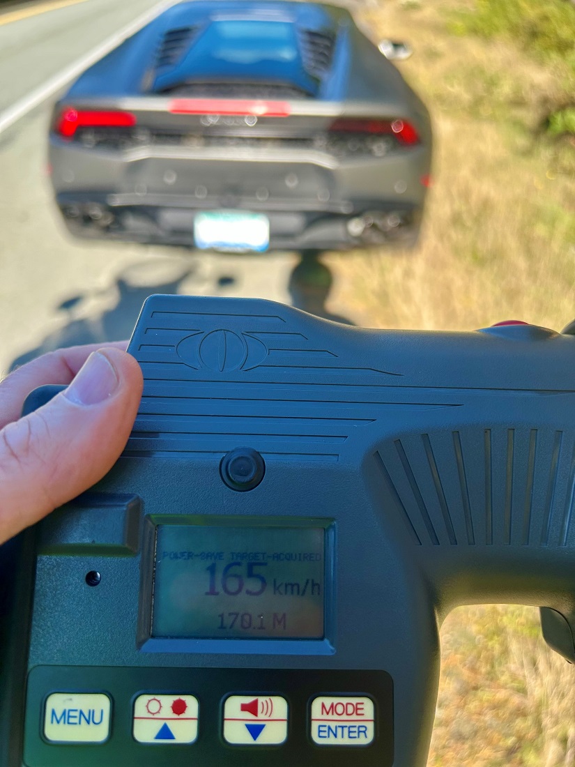 On October 13, 2025, at 1:55 p.m., on Highway #99 in Porteau Cove, a BC Highway Patrol motorcycle unit noticed a northbound Lamborghini Huaracan closing fast. The officer clocked the Lamborghini at 165 km/h in an 80 zone.