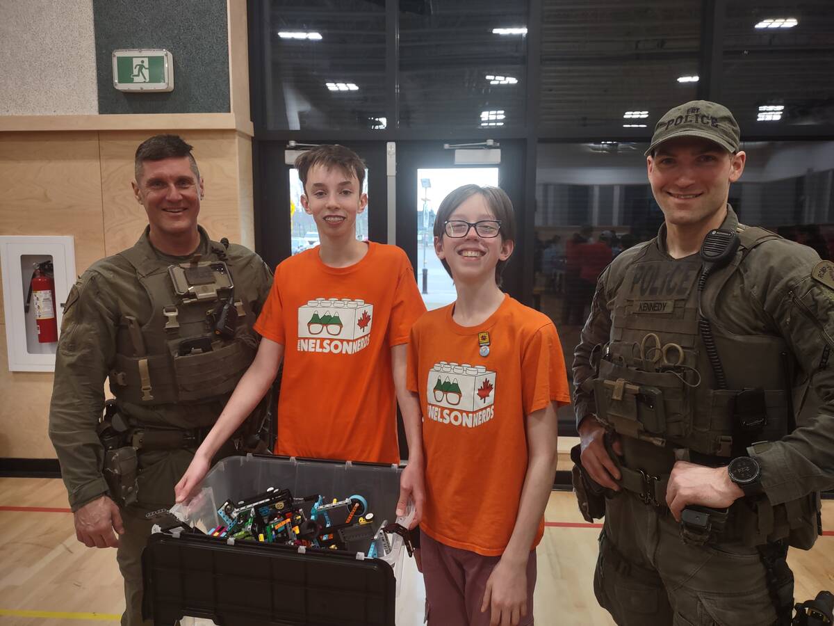 After winning first place at the regional event held at HMS, the “Nelson Nerds” consisting of Eric Bibby and Kasper Breisnes pictured below with the RCMP officers, went on to win the Champions award at the BC / Yukon event March 8 which has secured them a berth to a national event being held later this year.