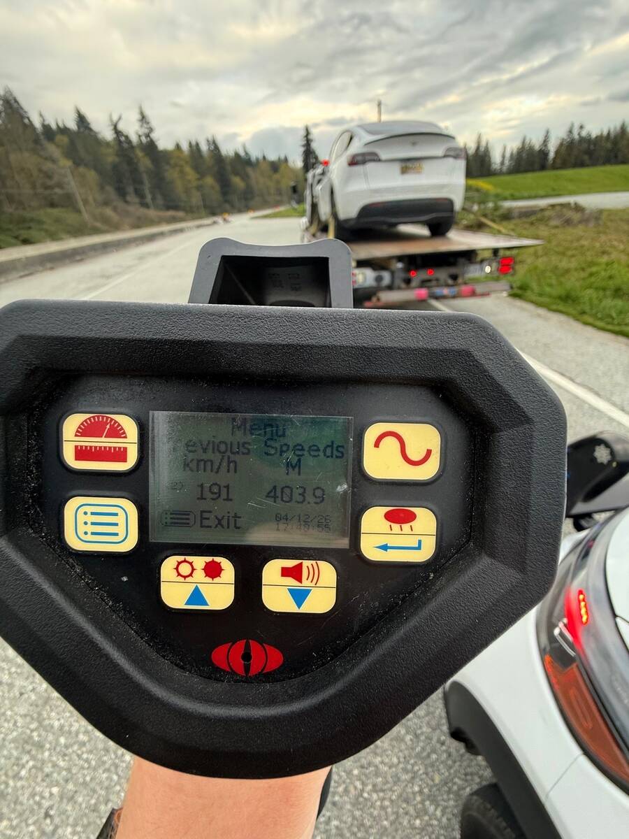 On April 12, 2026, at approximately 5:45pm, Maple Ridge RCMP’s Road Safety Target Team (RSTT) was conducting speed enforcement in the 25200 block of Lougheed Highway when they observed a white Tesla travelling at a high rate of speed. A laser reader clocked the Tesla driving 191km/h in a posted 80km/h zone (111km/h over the speed limit). Once pulled over the driver was subjected to a roadside Approved Screening Device (ASD) test after displaying signs of impairment. The driver failed the ASD test, meaning his blood alcohol concentration was greater than 100 mg%.