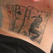 - Tattoo of a joker, ace of spades and king of hearts cards on right side of neck