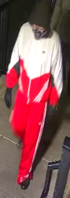 - Wearing a white and red Adidas brand track suit with a black hood, black gloves, black shoes and a black and white patterned bandanna covering on their face.