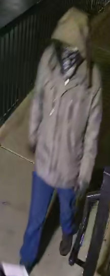 - Wearing a green or grey cargo style jacket with the hood up, blue jeans, black shoes, black gloves and a black and white patterned bandanna covering on their face.