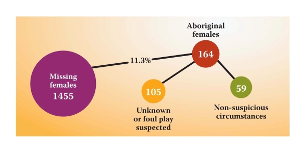 - As of April 2015, for all police jurisdictions in Canada, there were 174 missing Aboriginal female cases. This represents 10% of the 1,750 missing females reported on the Canadian Police Information Centre (CPIC).