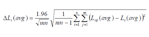 c) Using the minimum specified number of source and fixed microphone positions (i.e., 2 source positions, 5 microphone positions) in a wide range of rooms, the average 95% confidence interval for Ls(avg) has been found to be ±1.1 dB using omni-directional sources, and ±1.6 dB using directional sources [4]. Uncertainty in the final value of SPC will be no smaller than this. Rooms that are smaller than 60 m3 or larger than 200 m3 with a reverberation time less than 0.6 s will likely have larger uncertainties.