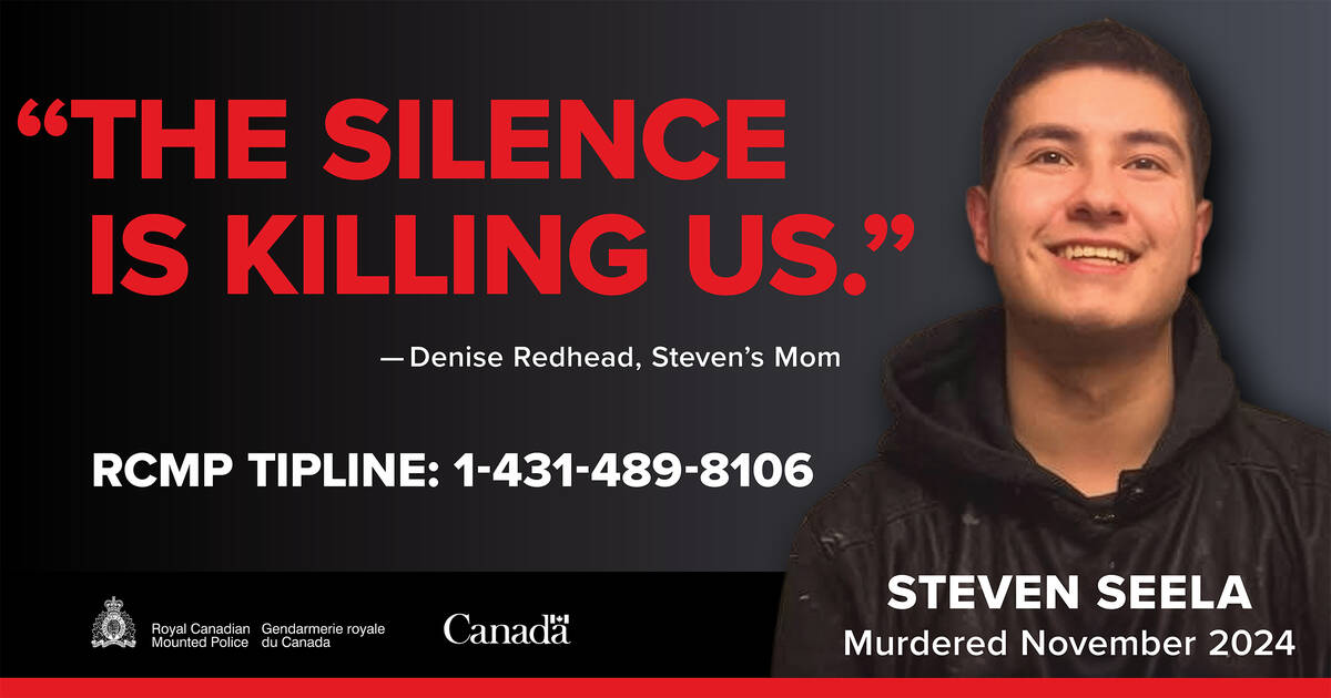 On Tuesday, April 14, 2026, the Manitoba RCMP has placed billboards and posters in various locations across Thompson to raise awareness about the unsolved case of Steven Seela who was murdered in Thompson in November of 2024.