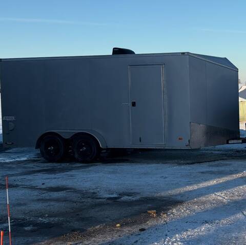 The trailer is described as a gray 2021 Bravo SC71 enclosed trailer, with New Brunswick license plate TVU 878 and vehicle identification number 542BC1624MB035931.