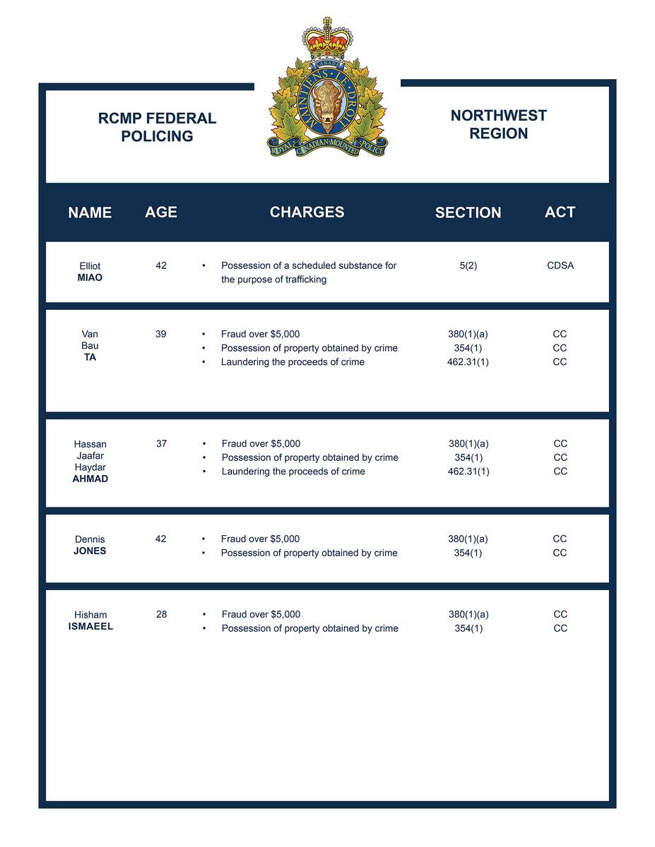 - Elliot Miao (42), Van Bau Ta (39), Hassan Jaafar Haydar Ahmad (37), and Dennis Jones (42) are scheduled to appear at the Alberta Court of Justice in Edmonton today.