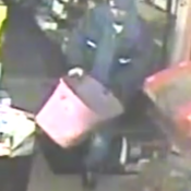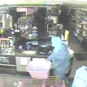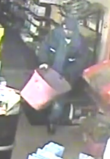 The suspect is seen on camera wearing dark coloured clothing including a toque, a hooded sweatshirt, and a dark blue jacket with a horizontal light-coloured reflective stripe.